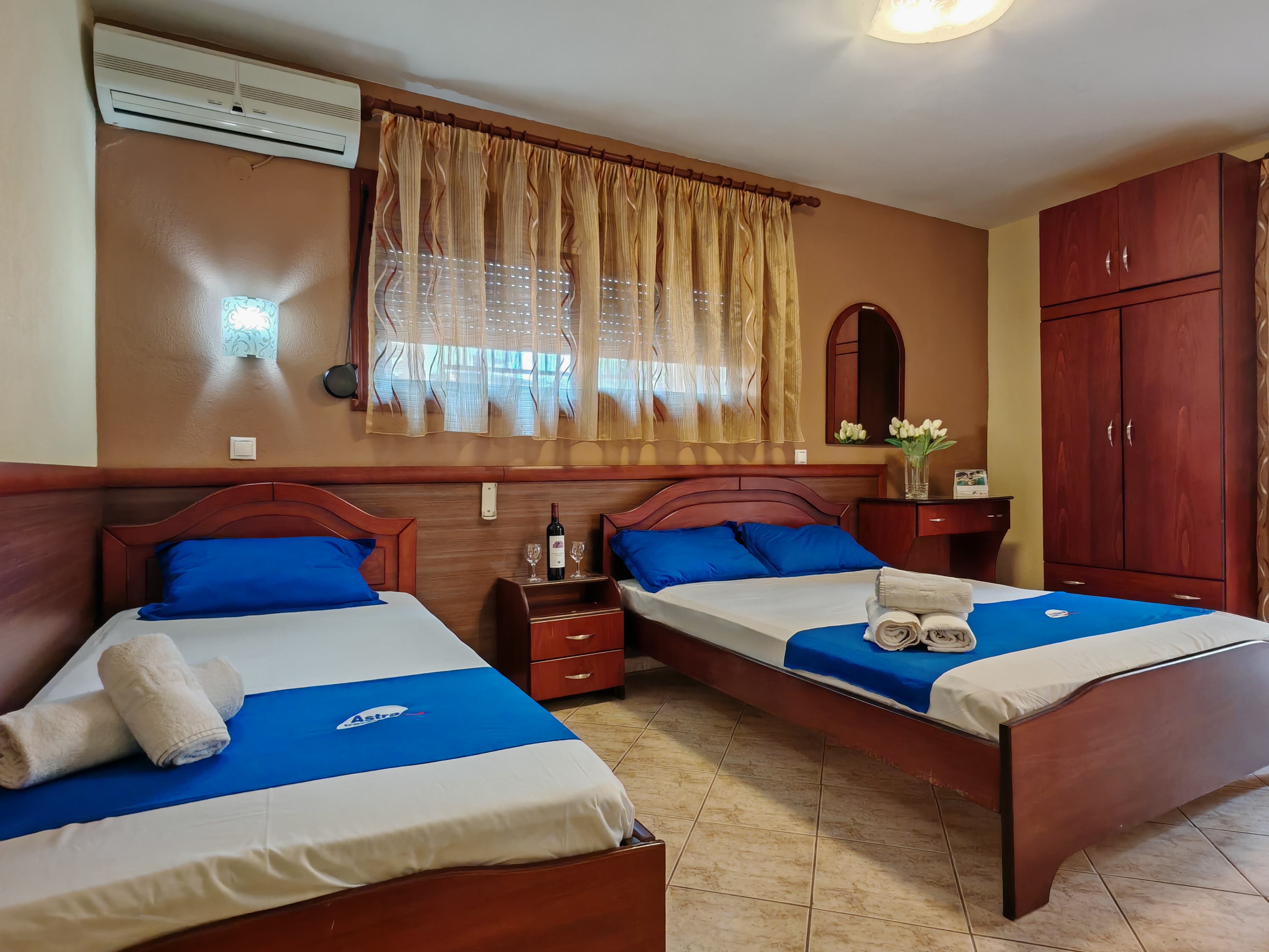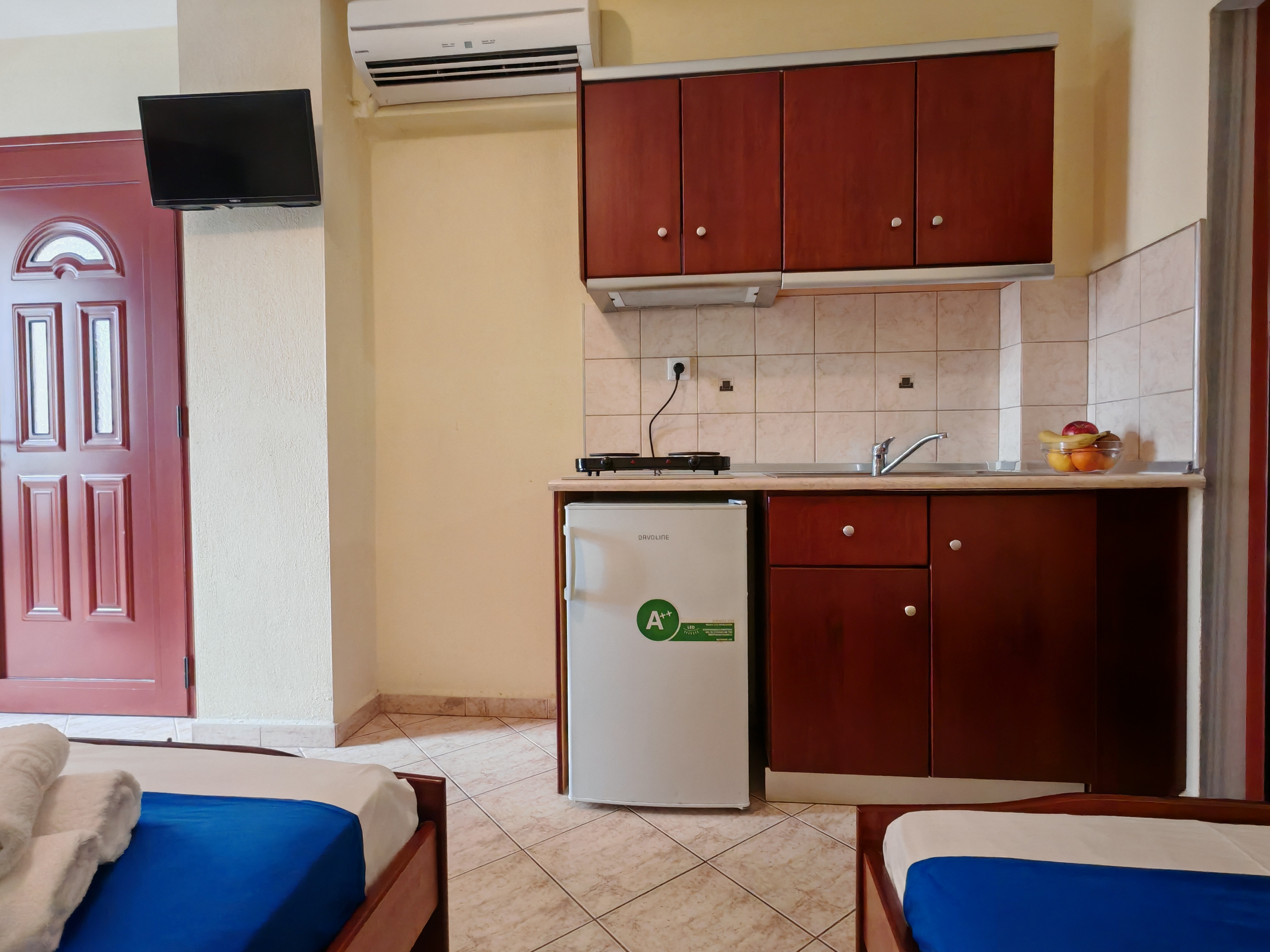 Elhelyezés: emeleti 2-3 fős stúdiókban, melyek mindegyike konyhasarokkal, ingyenes WiFi-vel, TV-vel, zuhanyzó/WC-vel és balkonnal vagy terasszal rendelkezik. Légkondicionáló használata július és augusztus hónapban ingyenes, a többi időpontban a helyszínen befizethető (kb. 6 EUR/stúdió/nap áron).